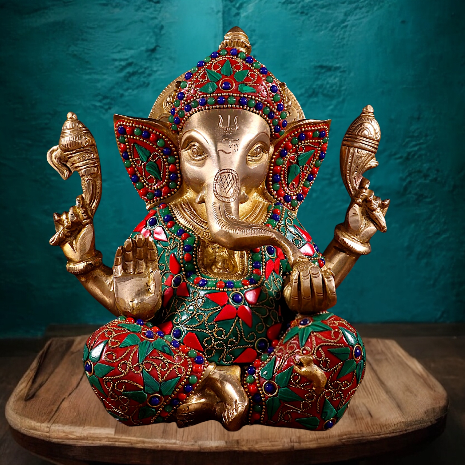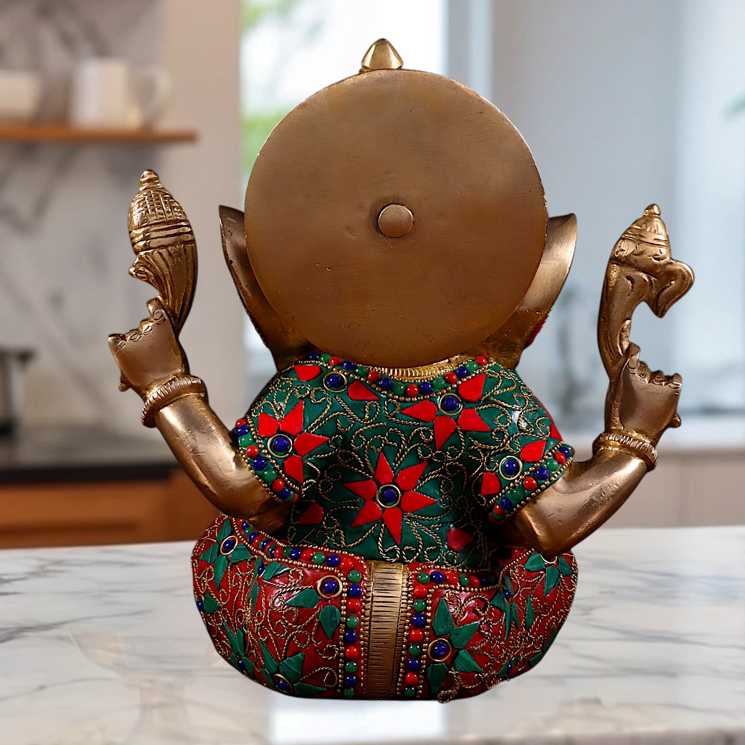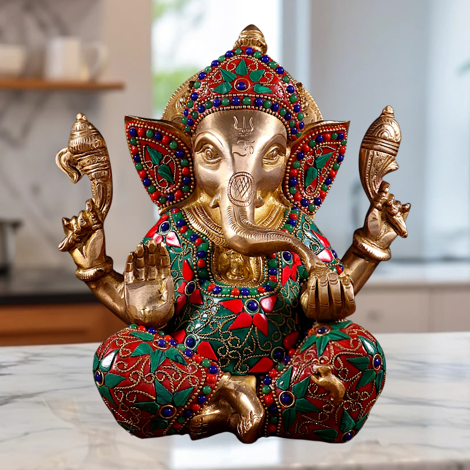This handmade Brass Ganesha Statue (8 inch) is beautifully crafted in an multicolor stonework golden finish to bring prosperity, wisdom, success, and positive energy to your home and office. Perfect for puja room décor, living room decoration, vastu placement, and festive gifting.